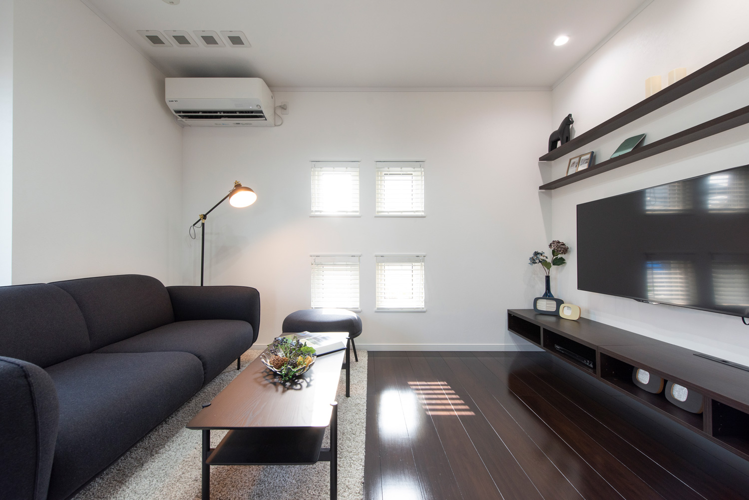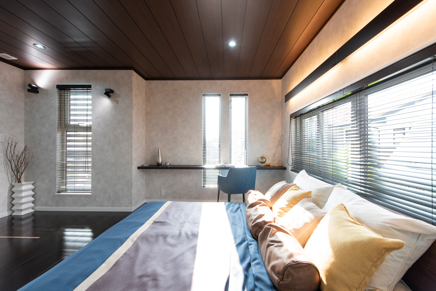 モダンでスタイリッシュなデザインをベースに、和のテイストをとり入れた和モダンがテーマ。 間接照明と黒を基調とした和室は高級旅館をイメージさせます。2階の子供部屋には、お子様の成長に合わせて使える固定階段のロフトを設置。和のテイストが醸し出す上質な空間をご体感ください。